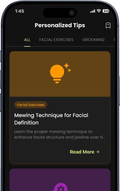 A recommendation engine built using Firestore + custom logic layers categorizes tips into: Facial exercises, Grooming, Skincare, Lifestyle. The engine evaluates user data daily and recommends the highest-impact edits.